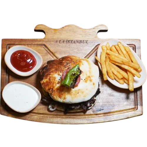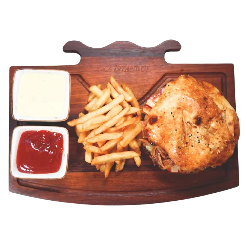 Beef döner, lettuce, tomato, onion, pickles and chef house sauce in freshly baked Tombik bread